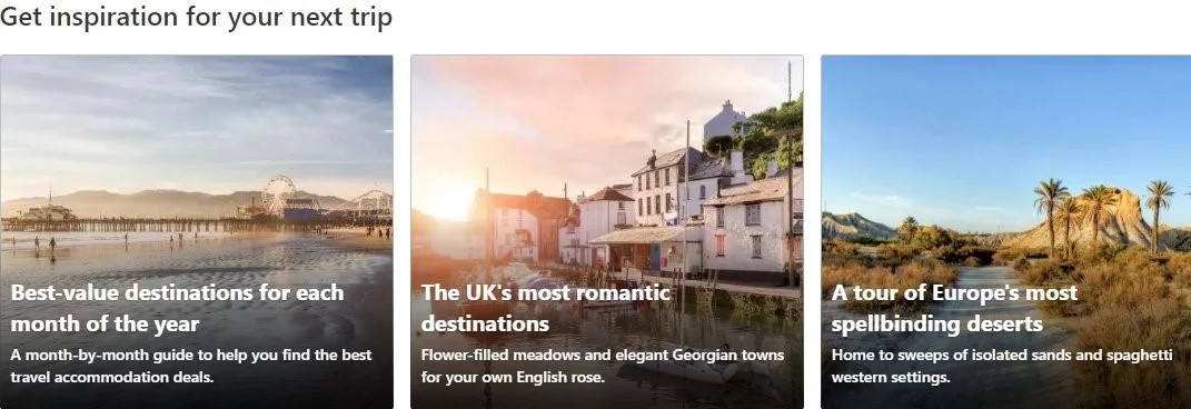 Booking.com در مثال زیرمکان هایی را که گردشگران بیشتر در جستجوی آن بوده اند تجزیه و تحلیل می کند و تورهای مختلفی را برای هر سلیقه ای ارائه می دهد، از بهترین مقاصد انگلستان گرفته تا جذاب ترین جزایر استرالیا. این امر نشان می دهد که چگونه باید به یک ماژول تحلیلی یا افزودن شخص ثالث برای بخش تجزیه و تحلیل وب سایت خود اهمیت دهید.